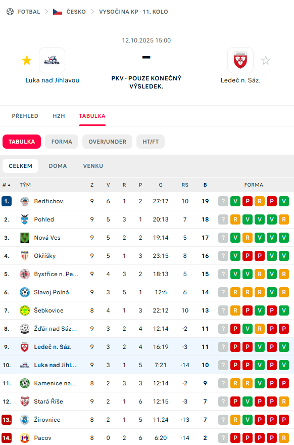 V 11. kole 5. ligy Kraje Vysočina přivítá naše áčko souseda v tabulce. Soupeř z Ledče nad Sázavou má o pouhý jeden bod více. Co se týče skóre, tak jsou na tom podstatně lépe, než naše áčko, kdy po devíti odehraných utkání mají na svém kontě již 16 vstřelených branek a 19 inkasovaných. Na venkovních hřištích si nováček z Ledče vede v poměru 1 výhra – 1 remíza – 2 prohry se záporným skóre 4:7.